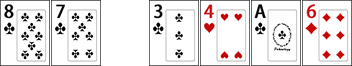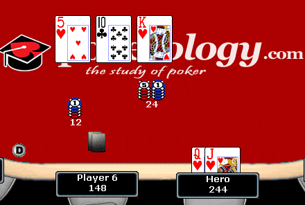 Here we have a straight and a flush draw, meaning we have 15 possible outs. The odds of hitting one of our outs on the turn is 31.9% or 2.13-to-1. The pot contains $36 ($24 + $12) and it’ll cost us $12 to call.
