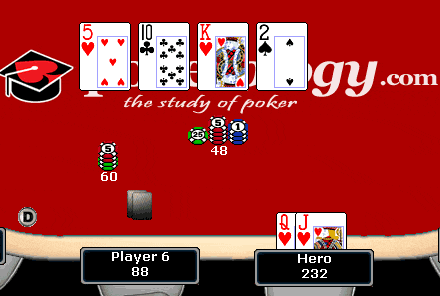 The pot odds are now 1.8-to-1 (108 / 60) or 35.7% in percentage terms. Our drawing odds are 2.07-to-1 or 32.6%. Since the pot odds are less than the odds of hitting, in this instance we should fold. To call a bet here we’d need the pot to be a little bigger or our opponents bet to be a little lower. He has priced us out with his overbet.