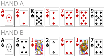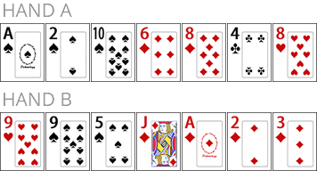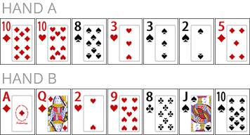 This example would be a split pot. Hand A takes the high hand with a pair of tens and hand B wins the low hand. Hand A did not have a qualifying low hand.