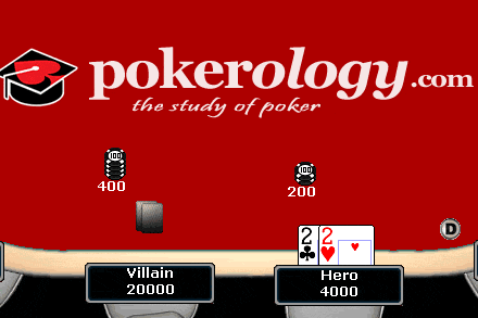 20. You're playing in a no-limit hold'em tournament and it has been folded to you in the small blind where you're holding a pair of deuces. The blinds are 300/600, and after posting the blinds you have 4,000 and the big blind has 20,000, as shown here: