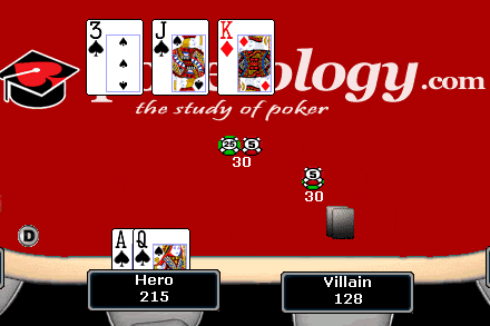 The big blind is a fairly loose player and you reason that if you push all-in, he’ll call with a wide range of hands; 22+, A2s+, K7s+, Q7s+, J7s+, A2o+, K7o+, Q7o+, J7o+ (38.5% of all hands). What is your total expectation if you decide to push all-in?